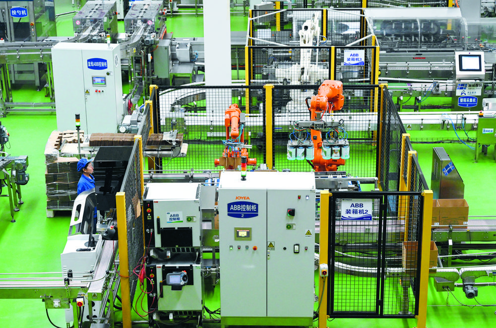 在君乐宝乳业集团奶粉生产线,数智化设备正在进行奶粉的自动化包装。